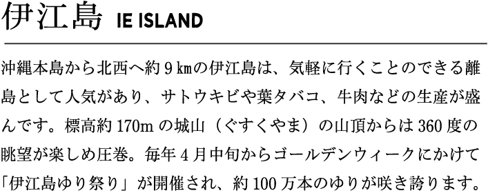 沖縄本島周辺の15離島、離島と行っても簡単にアクセスできる島もたくさん。あこがれていたあの風景は、思っていたよりも近くにあるのかもしれない。もっと沖縄らしさを感じに、さぁ島旅に出かけよう。